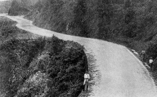 A velha Estrada do Mar, no trecho da serra, em 1910. Note-se o volante à direita no carro, seguindo o padrão inglês de direção do trânsito