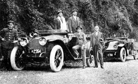 Membros da Comissão Geográfica de São Paulo que em 1910 estudaram a transformação da Estrada do Vergueiro no Caminho do Mar. Alguns livros erroneamente informam que esta foto seria da primeira descida de automóvel pela Serra do Mar, entre São Paulo e Santos