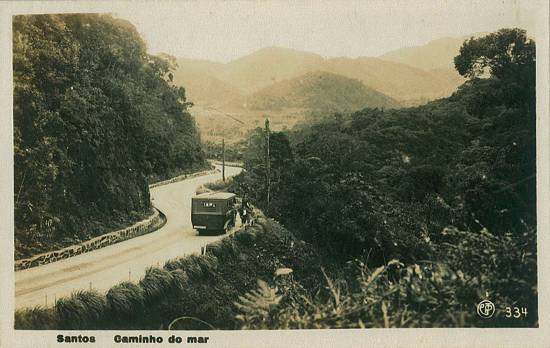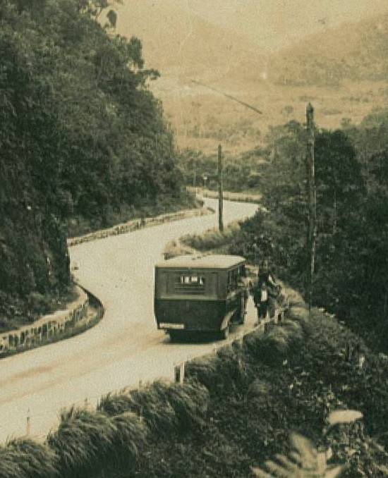 No detalhe da imagem acima: em 1933, era possível o ônibus tipo jardineira parar numa curva da estrada deserta para os passageiros calmamente registrarem uma fotografia da paisagem