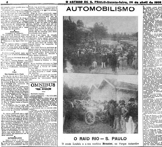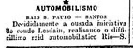 Decididamente a ousada iniciativa do conde Lesdain, realizando o dificílimo reide automobilístico Rio-S. Paulo, tem produzido e continuará a produzir benéficos resultados para o desenvolvimento do esporte do automóvel, entre nós.