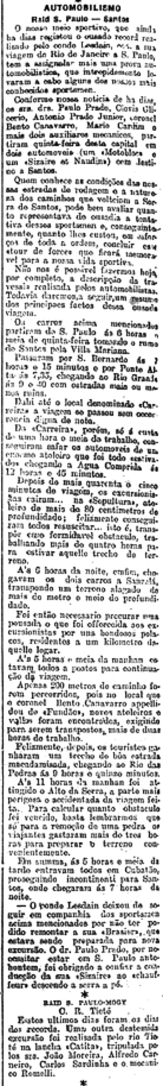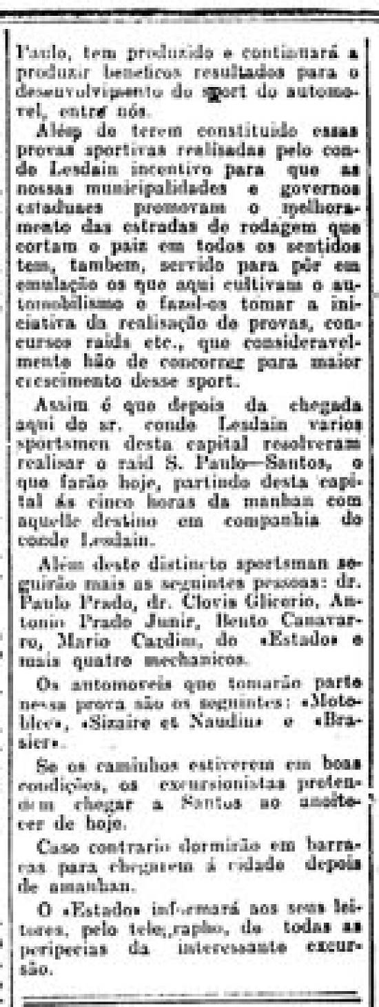 - O conde Lesdain deixou de seguir em companhia dos sportsmen acima mencionados por não ter podido remontar a sua Brasier, que estava sendo preparada para nova excursão. O dr. Paulo Prado, por necessitar estar em S. Paulo anteontem, foi obrigado a confiar a condução da sua Sizaire ao chofer, descendo a serra a pé.