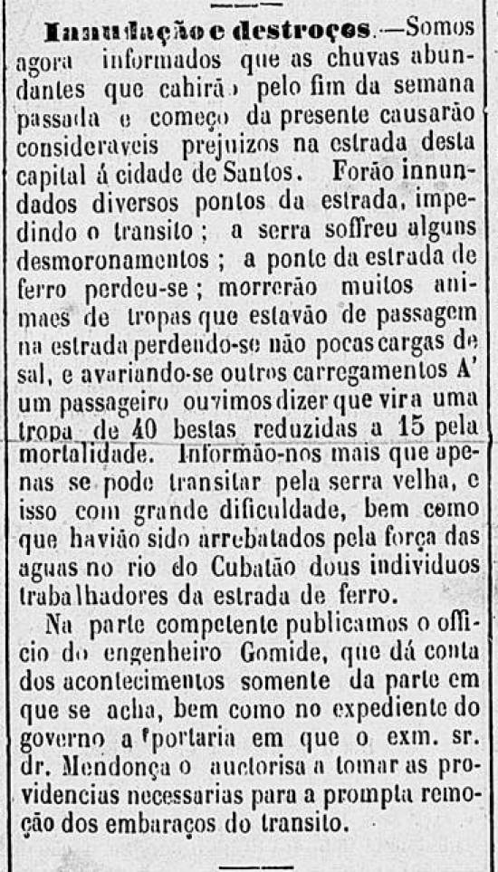 Inundação e destroços - Somos agora informados que as chuvas abundantes que caíram pelo fim da semana passada e começo da presente causaram consideráveis prejuízos na estrada desta capital à cidade de Santos. Foram inundados diversos pontos da estrada, impedindo o trânsito; a serra sofreu alguns desmoronamentos; a ponte da estrada de ferro perdeu-se; morreram muitos animais de tropas que estavam de passagem na estrada, perdendo-se não poucas cargas de sal, e avariando-se outros carregamentos. A um passageiro ouvimos dizer que virá uma tropa de 40 bestas reduzidas a 15 pela mortalidade. Informam-nos mais que apenas se pode transitar pela serra velha, e isso com grande dificuldade, bem como que haviam sido arrebatados pela força das águas no Rio Cubatão dois indivíduos trabalhadores da estrada de ferro.
