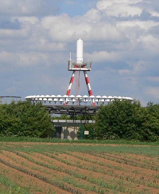A bem do rigor na explicação, é preciso esclarecer que não é uma antena, mas um total de 50 antenas brancas equidistantes, dispostas em círculo e fortemente iluminadas à noite, ao redor de uma antena central.