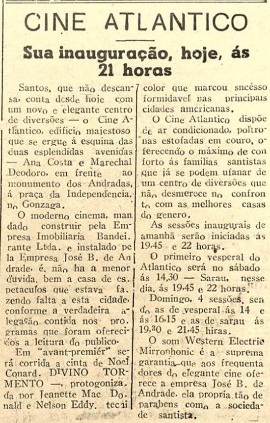 16/10/1941 a 31/5/1967 – Cine Atlântico – Praça da Independência, 1, Gonzaga. Este cinema da Empresa José B. de Andrade teve a pedra fundamental lançada em 24/8/1940 e foi inaugurado em 1941 com o filme Divino Tormento, com os cantores Jeanette Mac Donald e Nelson Eddy, em avant-première.