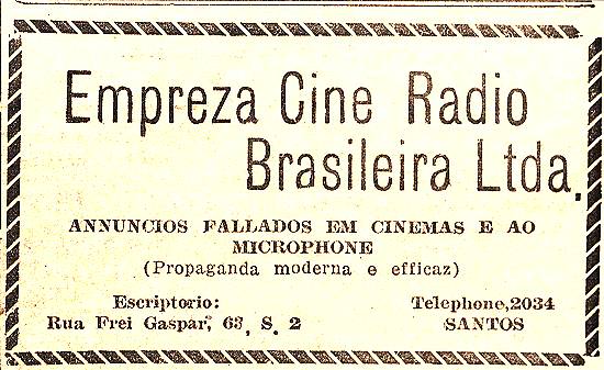 2/1/1942 – O jornal santista Correio da Tarde publicava anúncio da Empreza Cine Radio Brasileira Ltda., com escritório na Praça Rui Barbosa, 36, 1º andar, promovendo "Anuncios falados em cinemas e ao microfone (Propaganda moderna e eficaz)".