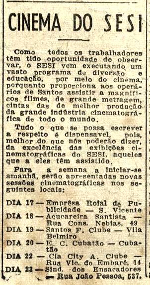 "Como todos os trabalhadores têm tido oportunidade de observar, o SESI vem executando um vasto programa de diversão e educação, por meio do cinema, porquanto proporciona aos operários de Santos assistir a magníficos filmes, de grande metragem, cintas das de melhor produção da grande indústria cinematográfica de todo o mundo.