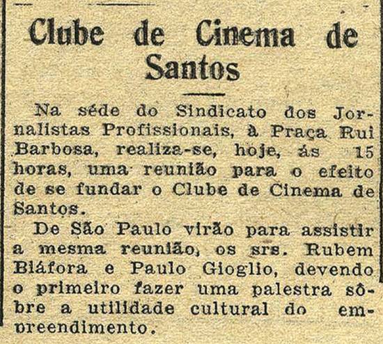 O Clube de Cinema de Santos teve seu encontro de fundação nas instalações santistas do Sindicato dos Jornalistas Profissionais, em outubro de 1948 Jornal O Diário, 16/10/1948, página 6