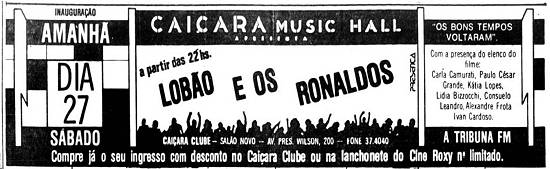 27/4/1985 a c.1987 – Inauguração do Caiçara Music Hall, nas instalações do Caiçara Clube, na Av. Presidente Wilson, 200, José Menino, com o lançamento do filme Os Bons tempos Voltaram, e a presença dos atores, entre eles Carla Camurati, Paulo César Grande, Kátia Lopes, Lídia Bizzocchi, Consuelo Leandro, Alexandre Frota e Ivan Cardoso. Os participantes também contaram com o espetáculo musical Lobão e os Ronaldos.