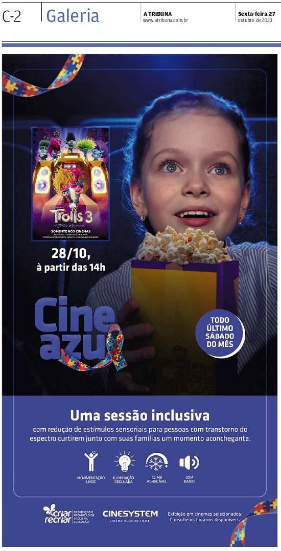 2023 a ...* Cine Azul, “uma sessão inclusiva com redução de estímulos sensoriais, para pessoas com transtorno do espectro autista curtirem junto com suas famílias um momento aconchegante. Movimentação livre, iluminação regulada, clima agradável, som baixo. Todo último sábado do mês”, em cinemas selecionados de Santos.