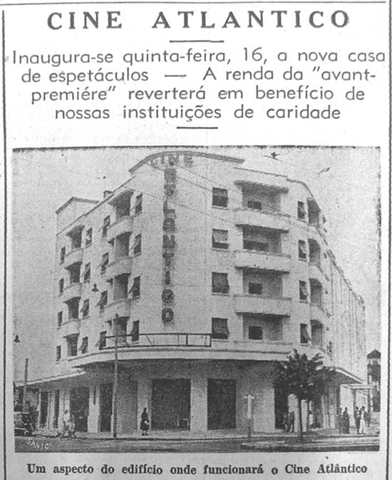 Com o filme da Metro Goldwyin Mayer, Divino tormento, espetáculo musical em tecnicolor, com Jeannete Mac Donald e Nelson Eddy, realiza-se na quinta-feira próxima, dia 16, o espetáculo de avant-premiére que inaugurará o Cine Atlântico, o majestoso cinema que a Empresa Imobiliária Bandeirante Ltda. acaba de construir, confiando o trabalho à firma técnica Duarte e Cia, e a Empresa José B. Andrade incluiu em seu círculo exibidor.