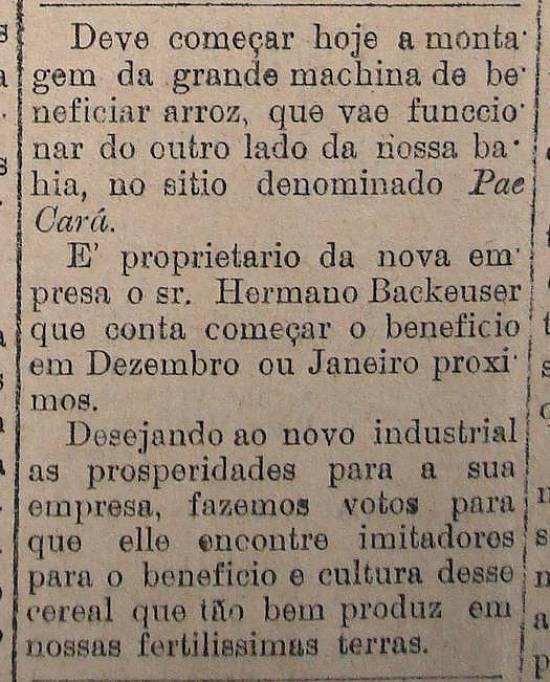 Entretanto, no Paicará, um arrabalde do então distrito santista do Guarujá, era em 1900 montado pelo empresário Hermano Backeuser um equipamento beneficiador de arroz, conforme registrou o antigo jornal Cidade de Santos, em 28 de julho de 1900: