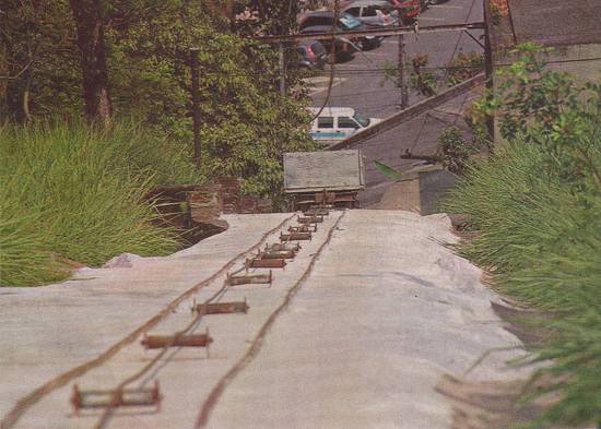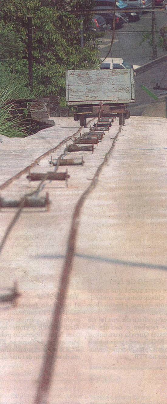Trechos dos trilhos usados pelos pequenos troles de madeira foram recuperados recentemente. Mecanismo é igual ao do bonde do Monte Serrat