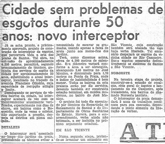 Já se acha pronto, e praticamente aprovado, projeto de construção de interceptor de esgotos, que percorrerá toda a orla das praias de Santos. Tal obra, na