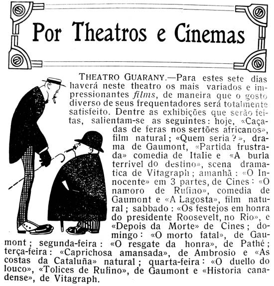 Teatro Guarany – Para estes sete dias haverá neste teatro os mais variados e impressionantes films, de maneira que o gosto diverso de seus freqüentadores será totalmente satisfeito. Dentre as exibições que serão feitas, salientam-se as seguintes: hoje, "Caçadas de feras nos sertões africanos", filme natural; "Quem seria?", drama de Gaumont; "Partida frustrada", comédia de Italie e "A burla terrível do destino", cena dramática de Vitagraph; amanhã: "O Inocente" em 3 partes, de Cines; "O namoro de Rufino", comédia de Gaumont e "A Lagosta", filme natural; sábado: "Os festejos em honra do presidsente Roosevelt, no Rio", e "Depois da Morte" de Cines; domingo: "O morto fatal", de Gaumont; segunda-feira: "O resgate da honra", de Pathé; terça-feira: "Caprichosa amansada", de Ambrosio e "As costas da Cataluña", natural; quarta-feira: "O duelo do louco", "Tolices de Rufino", de Gaumont e "História canadense", de Vitagraph.