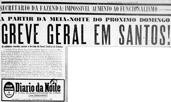 Foi decretada greve geral em Santos. A decisão foi tomada às 22,20 horas pelo Fórum Sindical de Debates. O movimento eclodirá a partir da meia-noite