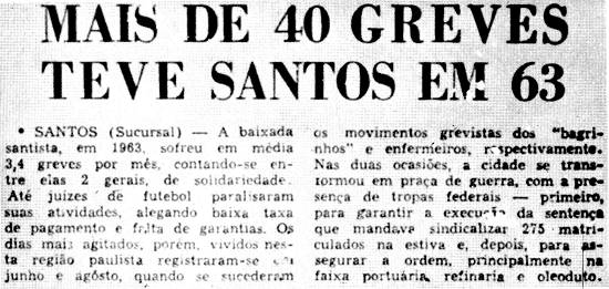 SANTOS (Sucursal) - A baixada santista, em 1963, sofreu em média 3,4 greves por