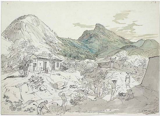 Esta imagem foi incluída na exposição, sendo válido lembrar que normalmente os artistas faziam esboços gerais das cenas, que até trocavam entre si, e posteriormente reproduziam as cenas na forma final. Assim, embora Taunay fizesse o registro em sua passagem por Santos em 1821, só em 1825 é que produziria a tela vista abaixo: