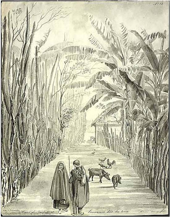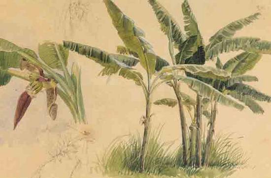 Cerca de cactos e Bananeiras denominadas da terra de Guimarães (pintado com pincéis e nanquim, em 1827, por Adrien-Aimée Taunay)