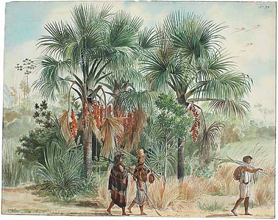 Visão do Paraíso, com palmeiras buritis no Cerrado de Mato Grosso (aquarela de Adrien-Aimée Taunay em 1827, um ano antes dele morrer afogado no Rio Guaporé)