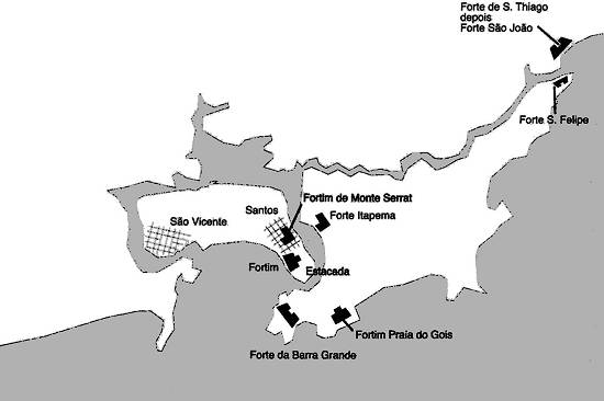 O Forte da Barra Grande e o Fortim na praia para cruzar o fogo foram construídos depois de 1591. O Fortim da Praia do Góis foi construído para defender desembarques e ataques do Forte da Barra, pela retaguarda. Os fortes de São Thiago e São Felipe com fogos cruzados foram construídos antes de 1570. Fonte: Katinsky, baseado em mapas do século XVI