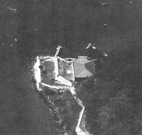Fotografia aérea do Forte da Barra Grande. Observar as cortinas das muralhas de defesa acompanhando os acidentes do terreno. Fonte: Arquivo IPHAN (1/3/98)