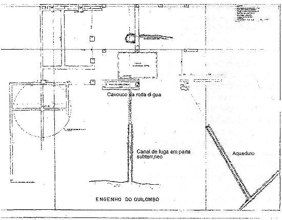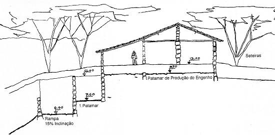 Engenho São Jorge dos Erasmos. Corte passando pelo sopé da rampa. Em engenhos do