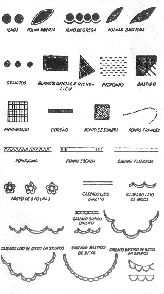 ponto oficial e do arrendado é feito o crivo; do Richelieu, o caseado recortado; do pesponto, o areia; do corda, as bordadeiras dos Morros de Santos