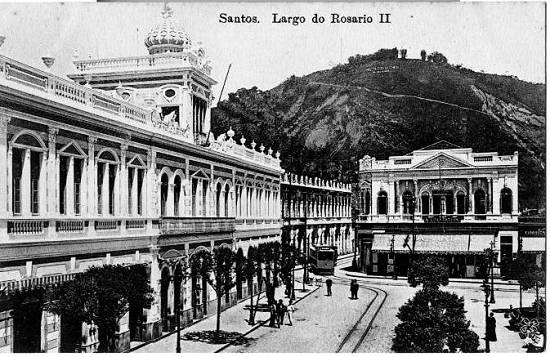 Praça Rui Barbosa em 1909, quando era chamada de Largo do Rosário, tendo ao centro a Rua Frei Gaspar e ao fundo o Monte Serrate. O local seria nos anos seguintes um reduto masculino