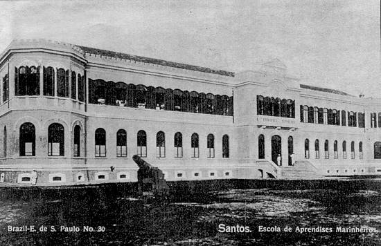 Quanto à Escola de Aprendizes-Marinheiros do Estado de São Paulo, sua construção foi iniciada em 1908, numa área de 118 [N.E.: metros] de frente por 1.100 de fundos, contando com 200 contos de réis do Governo Federal, 50 contos do Estado e a mesma quantia do município, respectivamente. Inaugurada pelo presidente Affonso Penna em maio de 1909, foi solenemente instalada no dia 6 de setembro daquele mesmo ano.