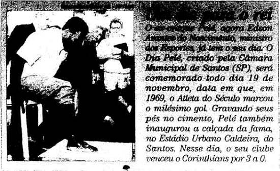 seu dia. O Dia Pelé, criado pela Câmara Municipal de Santos (SP), será comemorado todo dia 19 de novembro, data em que, em 1969, o Atleta do Século