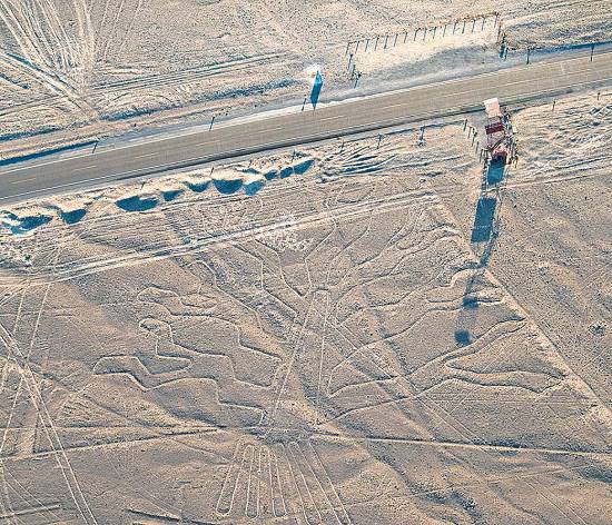 deserto de Nazca, ao sul do Peru. Partem de desenhos simples, até chegarem a intrincadas linhas formando macacos, beija-flores, aranhas, tubarões,