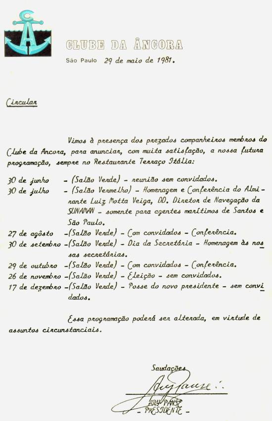 "Daí, Celso passou à ação, convidando todos os gerentes para tomar chope no Bar Brahma, sito à Avenida Ipiranga, e, nessa reunião, com a presença de somente quatro pessoas - que, salvo erro ou omissão, eram Celso Guimarães (da Delta Line), José Pereira de Almeida (da Dickinson), Sydney Kavanagh (da Sinarius) e Henrique Grinkraut (da ELMA), ficou deliberada a fundação do clube, cujo nome seria Âncora. Foi marcada, então, a primeira reunião com almoço para o dia 31 de janeiro de 1973, no restaurante Rubayat, na Avenida Vieira de Carvalho, quando Celso Guimarães assumiu o cargo de primeiro presidente.