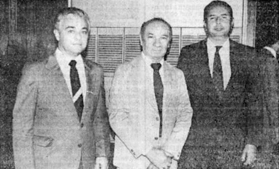 O capitão dos portos Sérgio Ribeiro de Vasconcellos (E) e o ajudante da capitania, Manoel José Cunha de Albuquerque (D) participaram de reunião-almoço do Clube da Âncora no Terraço Itália, em 28/11/1985, presidida por Francisco Zacharias de Lima (C)