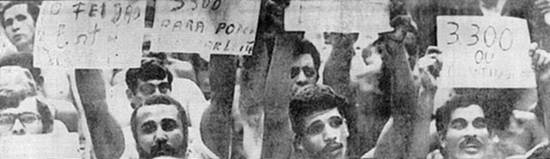Exibindo cartazes citando "Cr$ 3.300,00 ou nada", "Cr$ 3.300 é tudo"; "Chega de