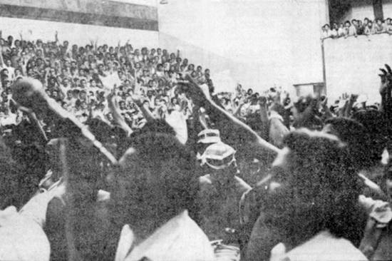 Antes do encerramento apoteótico em que os grevistas, inclusive mulheres, cantaram, todos de mãos dadas, o Hino Nacional, os alto-falantes anunciaram a presença, ali, dos presidentes de 10 sindicatos da Baixada Santista que iniciaram uma campanha de arrecadação de fundos para ajuda financeira ao movimento dos portuários.