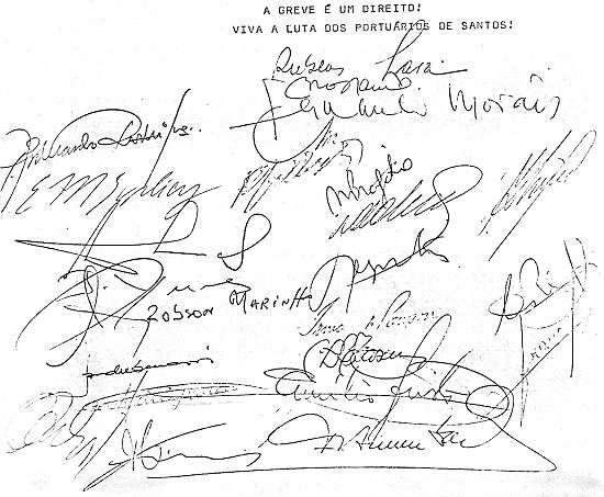 Entre dezenas de cartazes e faixas exibidos no ginásio, os manifestantes mostravam uma "resposta a um ilustre desconhecido: o Porto de Santos pode não ser nosso, mas este gigante está parado e parado ficará, porque esta é uma greve total, feita sem piquetes, que revela a consciência e a maturidade do trabalhador portuário".