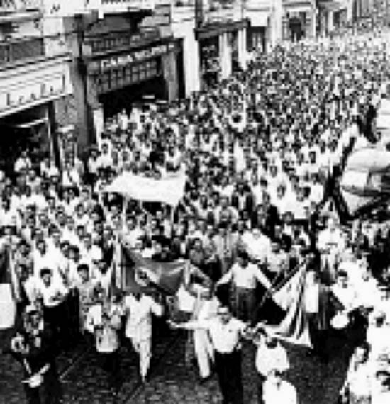 Passeata dos trabalhadores marítimos na Rua General Câmara, em 1959