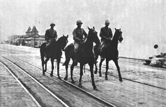 Cavalaria da Força Pública vigia o cais do porto, próximo ao atracadouro do ferry-boat para Vicente de Carvalho, durante as greves por volta de 1964