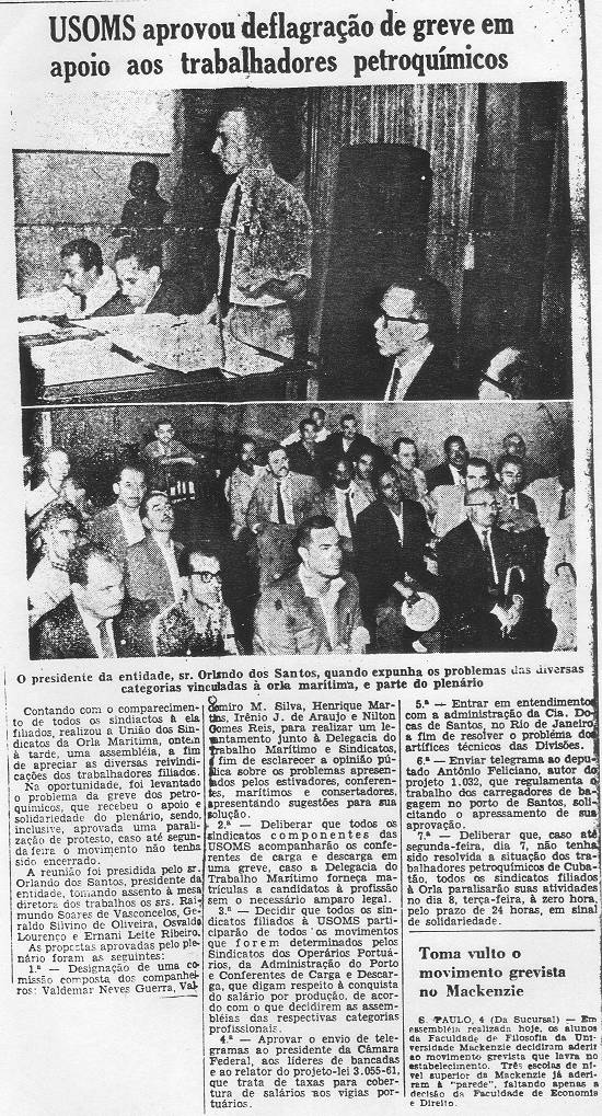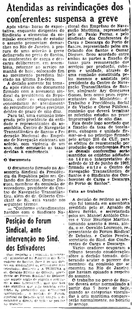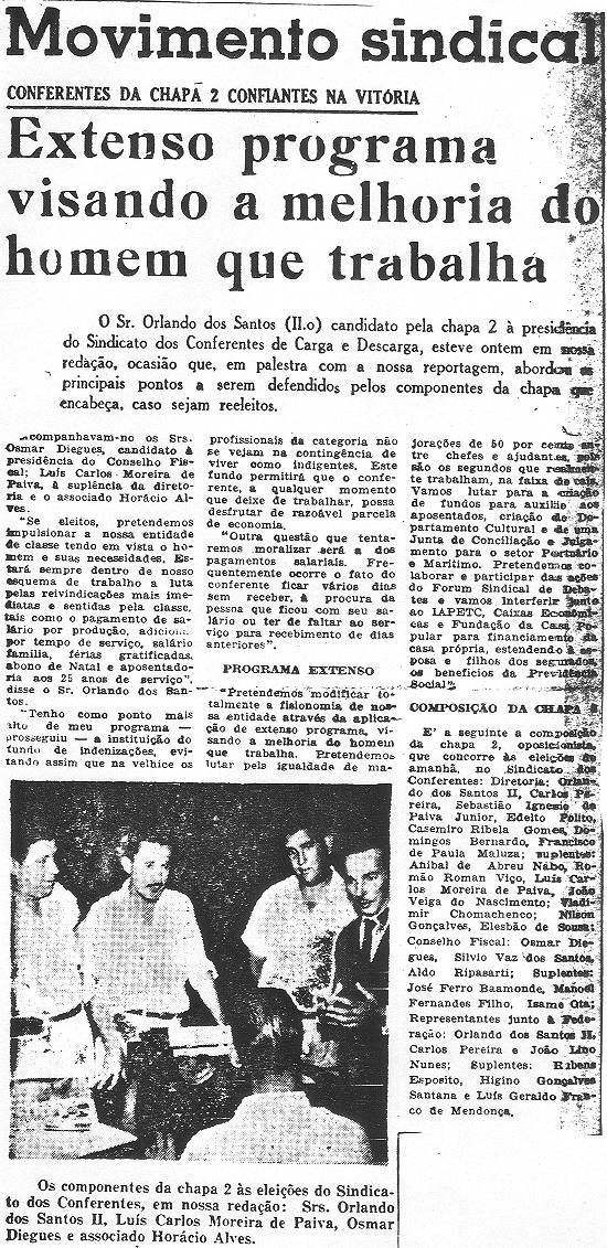 biográfico centrado no fundador da categoria dos conferentes, Orlando dos Santos, é acompanhado por diversos recortes de jornais: