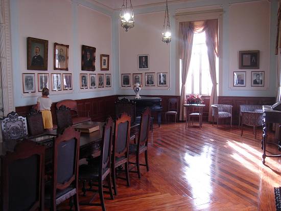 Outra vista do Salão Cerejeira, com a galeria de ex-presidentes, piano e outros objetos