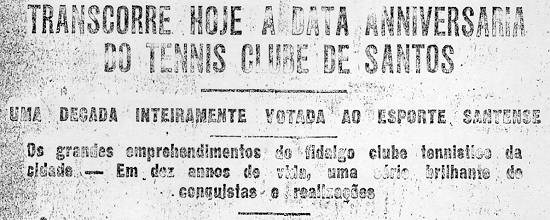 Bastante grata ao esporte santista é a efeméride de hoje, pois que assinala a passagem do décimo aniversário de fundação de um dos seus mais importantes núcleos esportivos: o Tênis Clube de Santos.