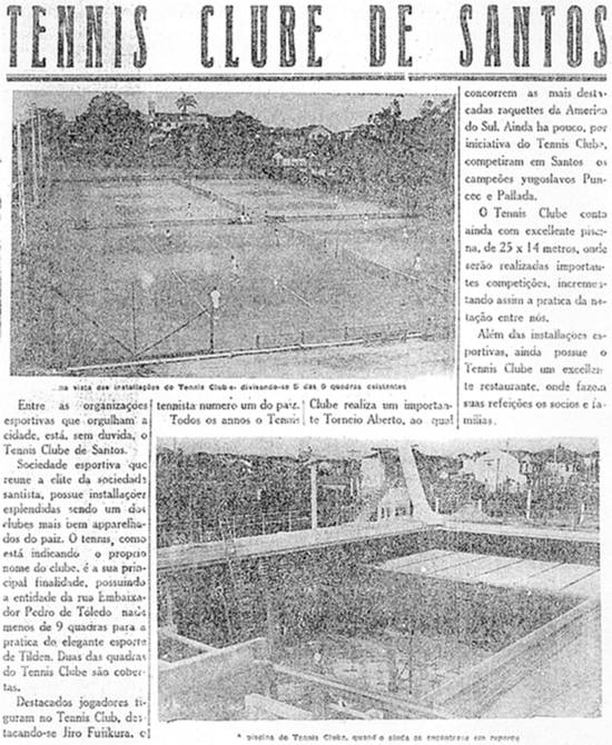 O notável empreendimento iniciado pelo Tênis Clube de Santos em 1930 - Campeonato Aberto da Cidade de Santos - muito tem contribuído para fazer florescer e impulsionar a atividade nesta cidade, além de estabelecer um forte elo entre as figuras mais celebradas das quadras do país.