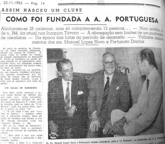 A Tribuna esteve em contato com duas pessoas perfeitamente autorizadas a relembrar a fundação da A. A. Portuguesa. São elas o sr. Manoel Lopes Novo, que foi o 2º. Presidente (1919), e Fortunato Dantas, benemérito, várias vezes campeão pelo referido clube.