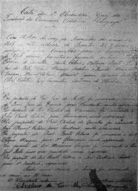 UM DOCUMENTO RARO E PRECIOSO – A ata da fundação da A. A. Portuguesa, onde se lê: - "A Acta da 1.a Assemblea Geral da Fundação da Associação Athletica Portugueza – Aos 20 dias do mez de Novembro do anno de 1917, nesta cidade de Santos, às 8 horas da noite realizou-se uma Assemblea para a fundação do Club acima, presentes os seguintes senhores: Avelino de Carvalho, Bento Ribeiro, Antonio Peixoto, José de Mello, Albino Marques, Seraphim de Almeida, Maximinio Campos, Manoel Ribeiro, Manoel Tavares, Casemiro Leitão, Abel Rabello, Luiz Fernandes, Antinio de Almeida. - Por proposta do Snr. José de Mello foi nomeado o Snr. Lino do Carmo para Presidente, sendo approvado. Por proposta do Snr. Avelino de Carvalho foi nomeado o Snr. Bento Ribeiro para Thesoureiro, sendo approvado. Por proposta do Snr. Avelino de Carvalho foi nomeado o Snr. Manoel Ribeiro para Secretario, sendo approvado. Por proposta do Snr. Bento Ribeiro foi nomeado o Snr. Albino Marques para 2.o Thesoureiro, sendo approvado. Por proposta do Snr. Maximinio Campos foi nomeado o Snr. José de Mello para vice-presidente, sendo approvado. Por proposta do Snr. Bento Ribeiro o Snr. Antonio Peixoto para 2.o Secretario, approvado – Nada mais havendo a tratar foi encerrada a sessão às 21 horas. O Presidente interino, Avelino de Carvalho – O Secretario interino, Alvaro Marques."