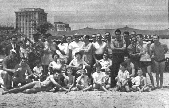 Freqüentadores da barraca de praia da AABB, na orla da praia santista, em 1955