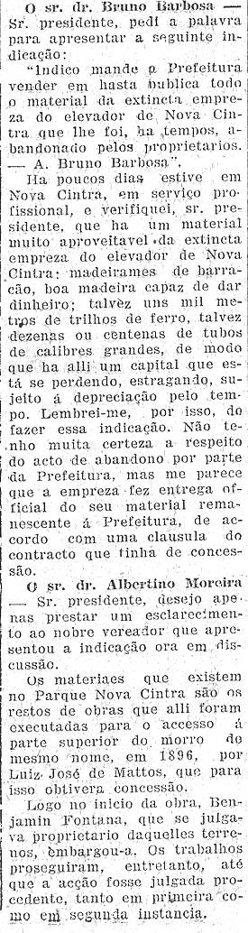 "Indico mande a Prefeitura vender em hasta pública todo o material da extinta empresa do elevador de Nova Cintra que lhe foi, há tempos, abandonado pelos proprietários. - A. Bruno Barbosa".