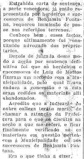 Acredito que a indicação do nobre colega terá o mérito de chamar a atenção da Prefeitura para o que se discutiu na ação a que me referi, e ficar finalmente verificado se os materiais em questão pertencem à Municipalidade ou aos sucessores de Benjamin Fontana.