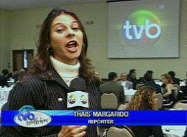 A repórter Thaís Margarido fala com o diretor da TV B, na festa de lançamento do programa Imagens: captura de tela, 19/7/2004, 13h16, arquivo Novo Milênio