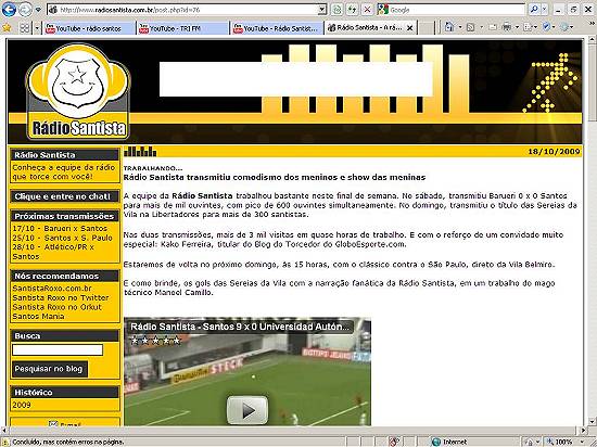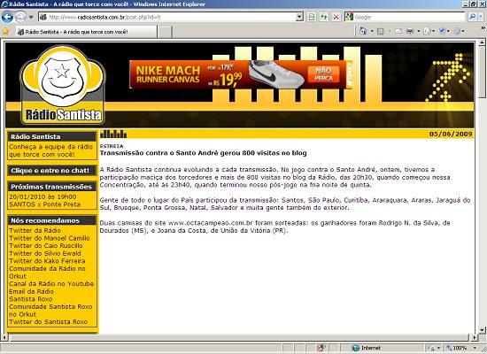 A Rádio Santista continua evoluindo a cada transmissão. No jogo contra o Santo André, ontem, tivemos a participação maciça dos torcedores e mais de 800 visitas no blog da Rádio, das 20h30, quando começou nossa Concentração, até às 23h40, quando terminou nosso pós-jogo na fria noite de quinta.
