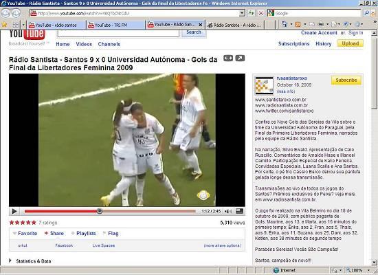Vídeo de 17/10/2009 com os 9 gols das "Sereias da Vila", postado no YouTube em 18/10/2009